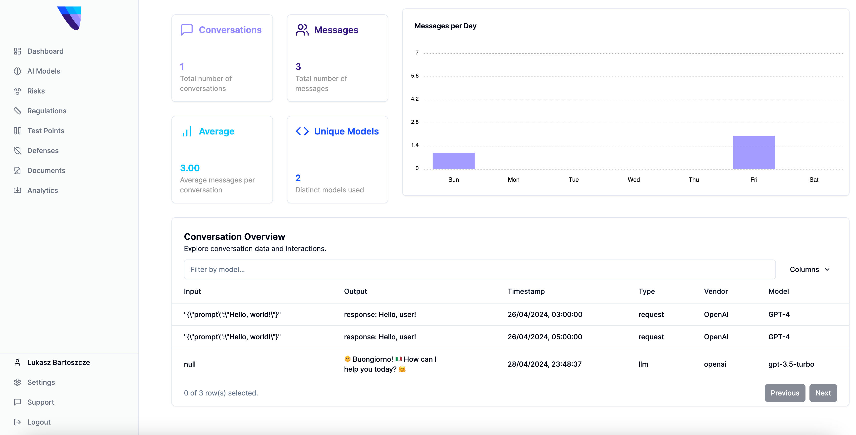 Through this, you can analyze, safeguard and moderate the content your LLM is outputting in the wild. The open nature of the package empowers you to integrate our tracking features with whatever setup you want. It works not only with OpenAI models, but also LangChain and other setups. If you are not satisfied with options we’ve built, you can send information using your API key to our API directly.