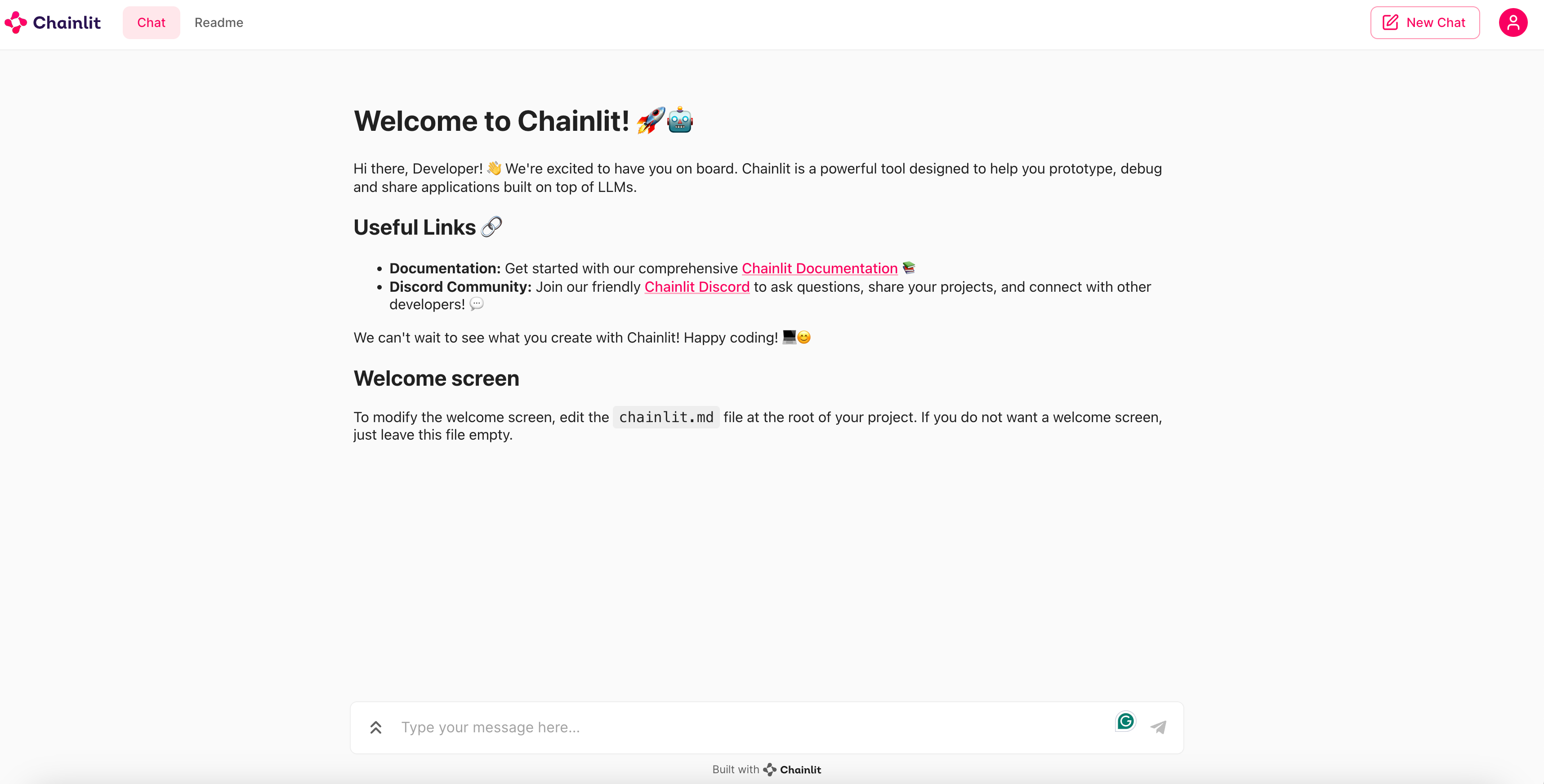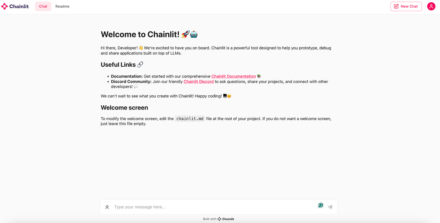 chainlit run "PATH_TO_THE_EXAMPLE” And you should see something similar to the setup below: